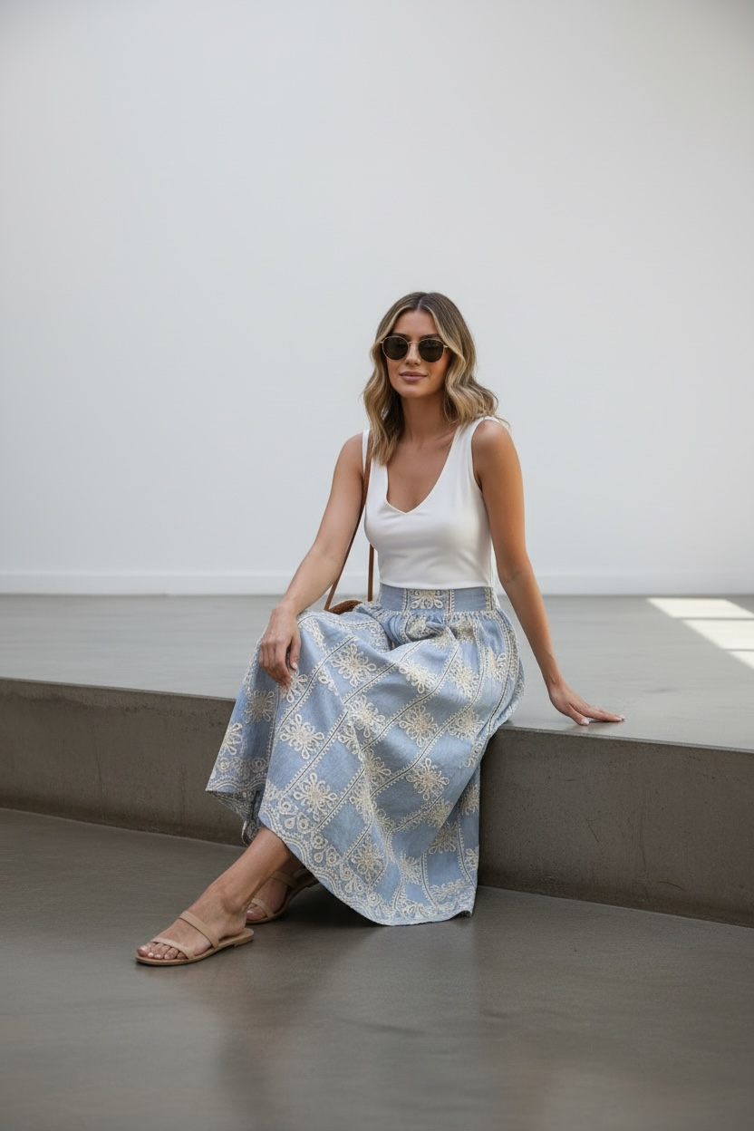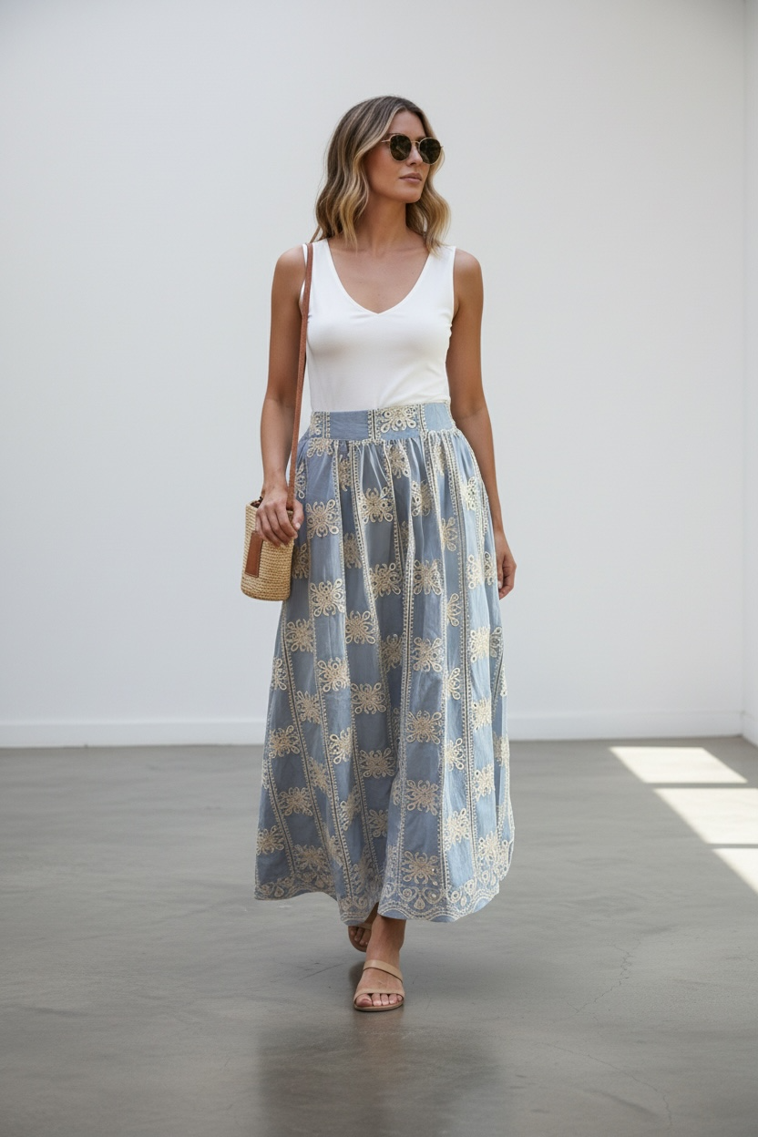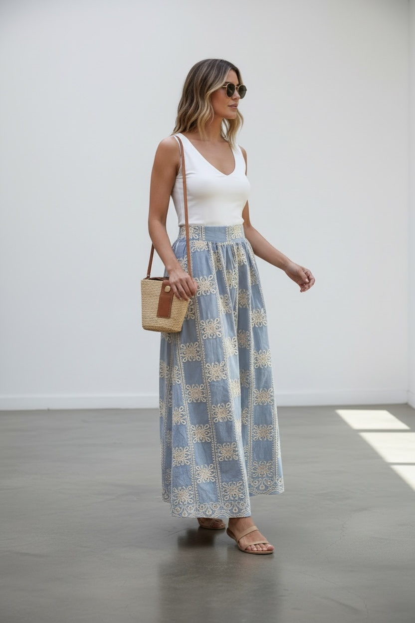 Descubre la Falda Antonella, una prenda que fusiona la comodidad del algodón con la delicadeza de bordados artesanales.