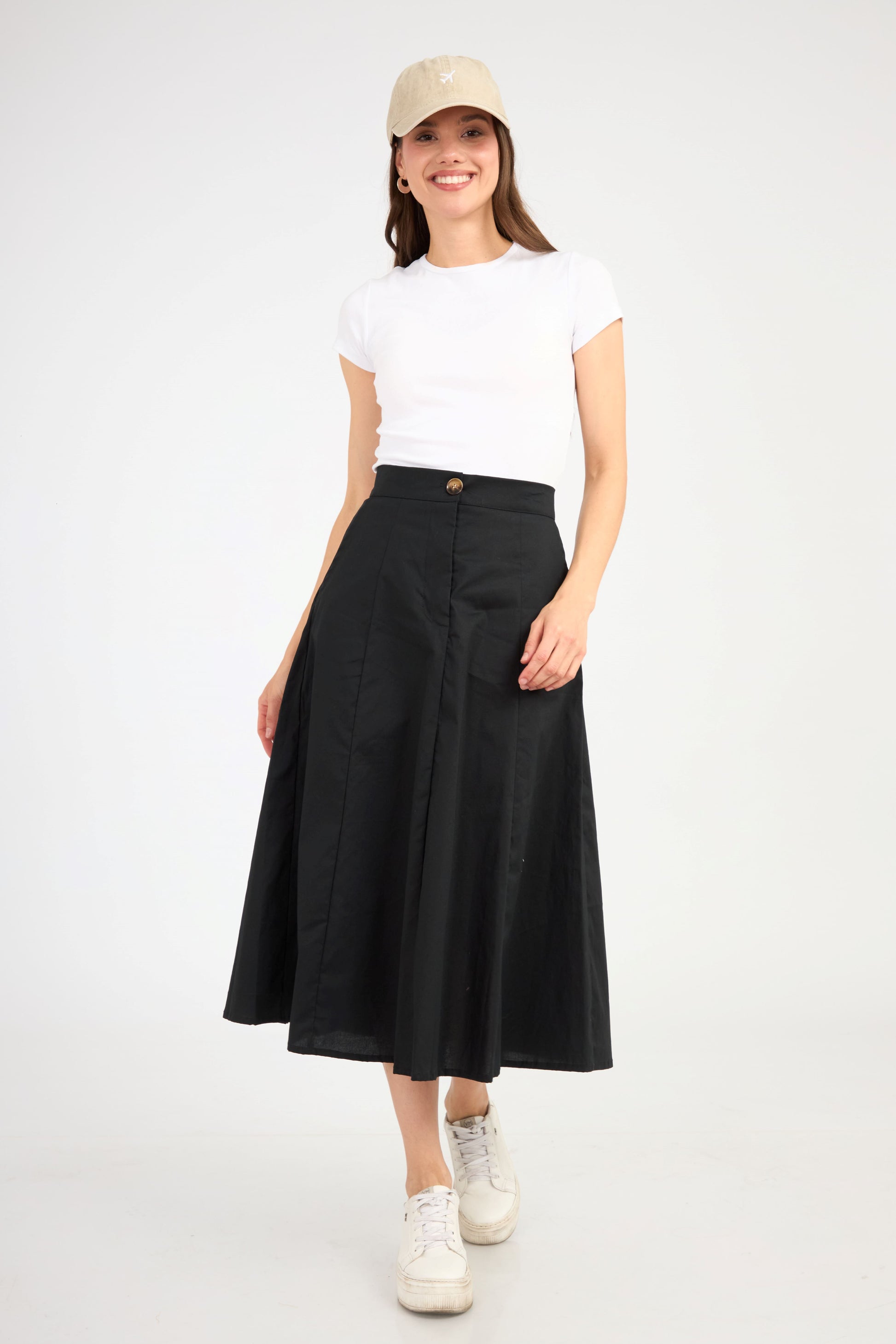 Es a la cintura y de largo midi. Cuenta con cierre y botón.