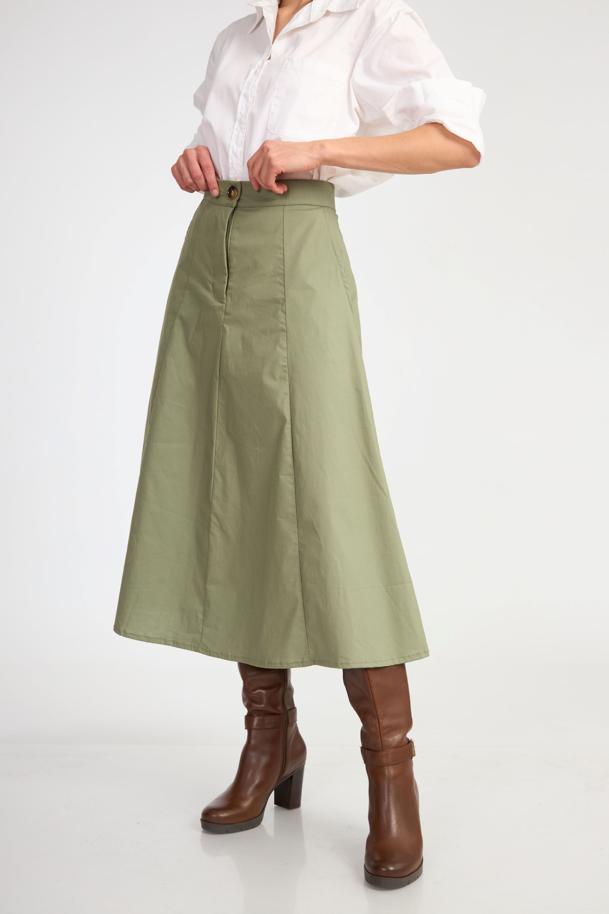 Es a la cintura y de largo midi. Cuenta con cierre y botón.