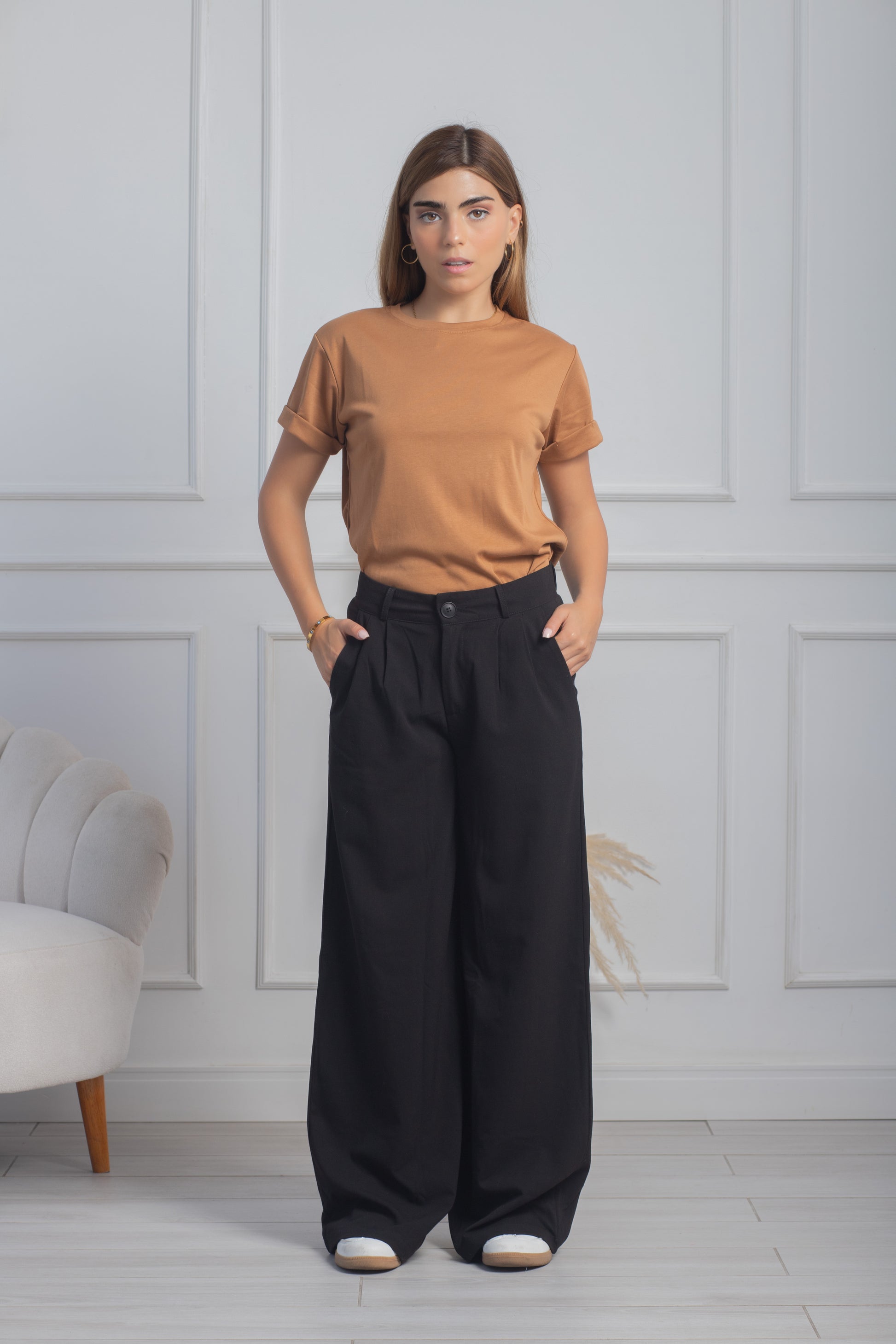 Pantalón palazo tipo sastre con bolsillos delanteros y pinzas.